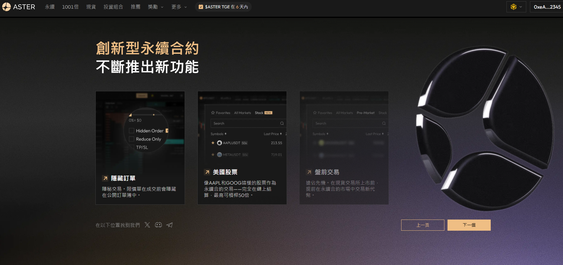 Aster:8.8%代币将于TGE解锁并分配,部分协议收入将用于回购 https://www.theblockbeats.info/flash/311205 Aster下一时代开启:积分空投第二阶段上线,TGE倒计时开始。https://www.theblockbeats.info/news/59559 支持的功能还挺多的,这里不多讲了