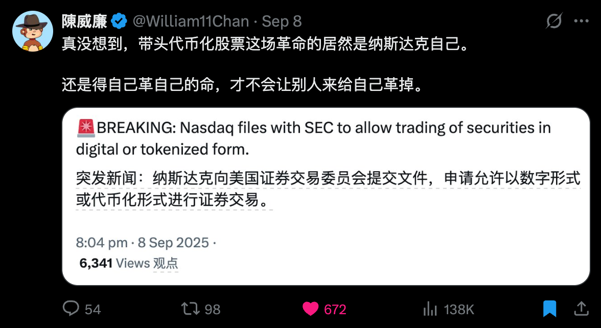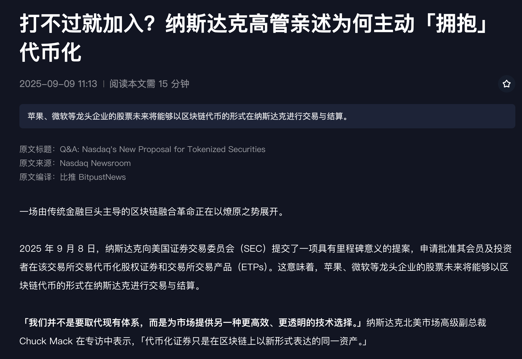 之前就有小平台在做美股代币化的事情,现在纳斯达克准备自己下场做了,RWA趋势已经很明显了,如果还在装作看不到,那该怎么在投资市场盈利呢?打不过就加入?纳斯达克高管亲述为何主动「拥抱」代币化