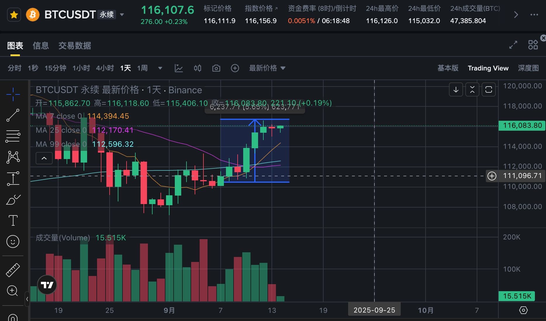 BTC 110500-116500 7000点的缓慢的单边上涨行情 三个代币的价格走势几乎和比特币一致,都是处于一个慢慢涨的状态,等你后面发现他在涨的时候,他已经悄悄涨了好多了