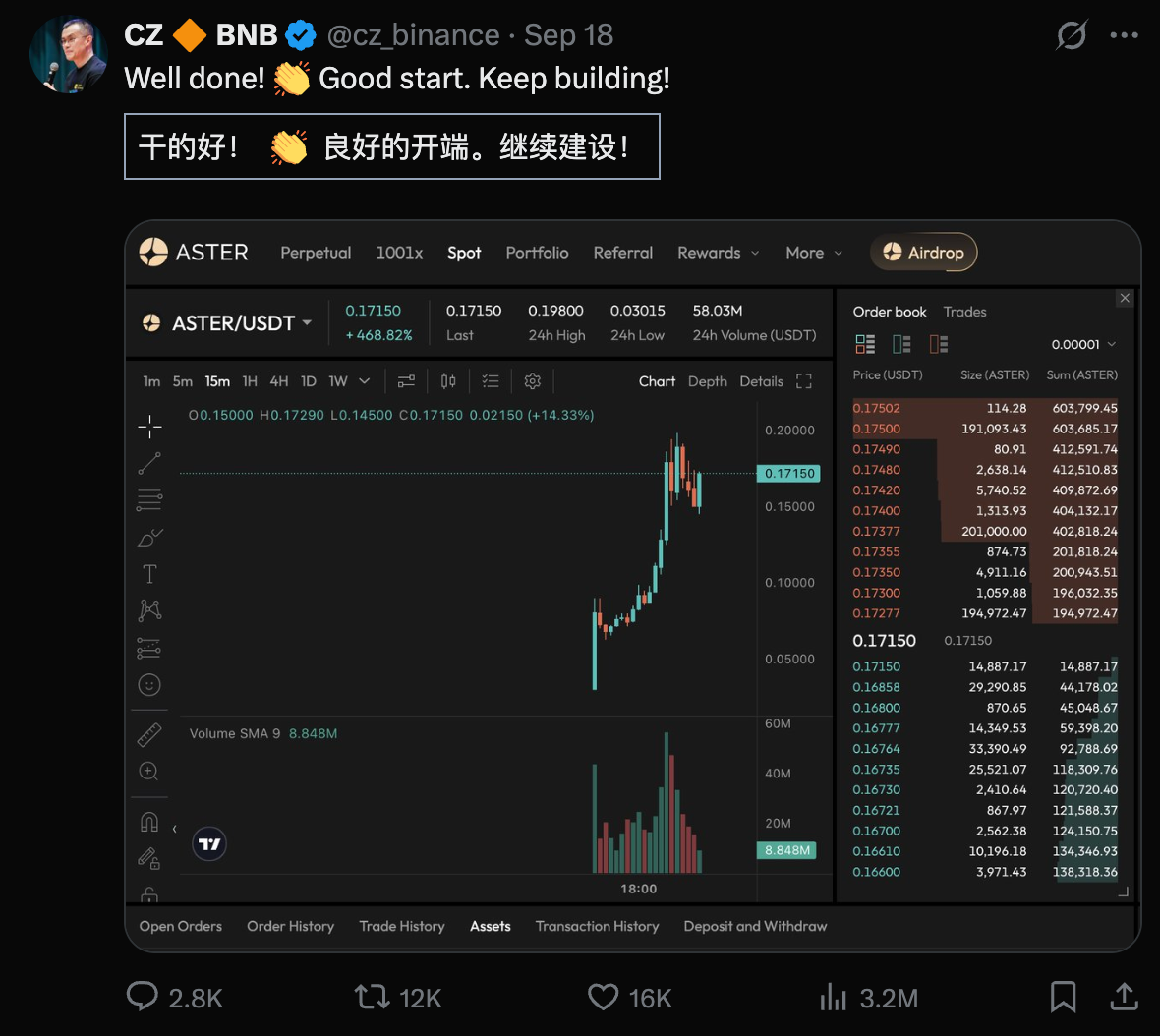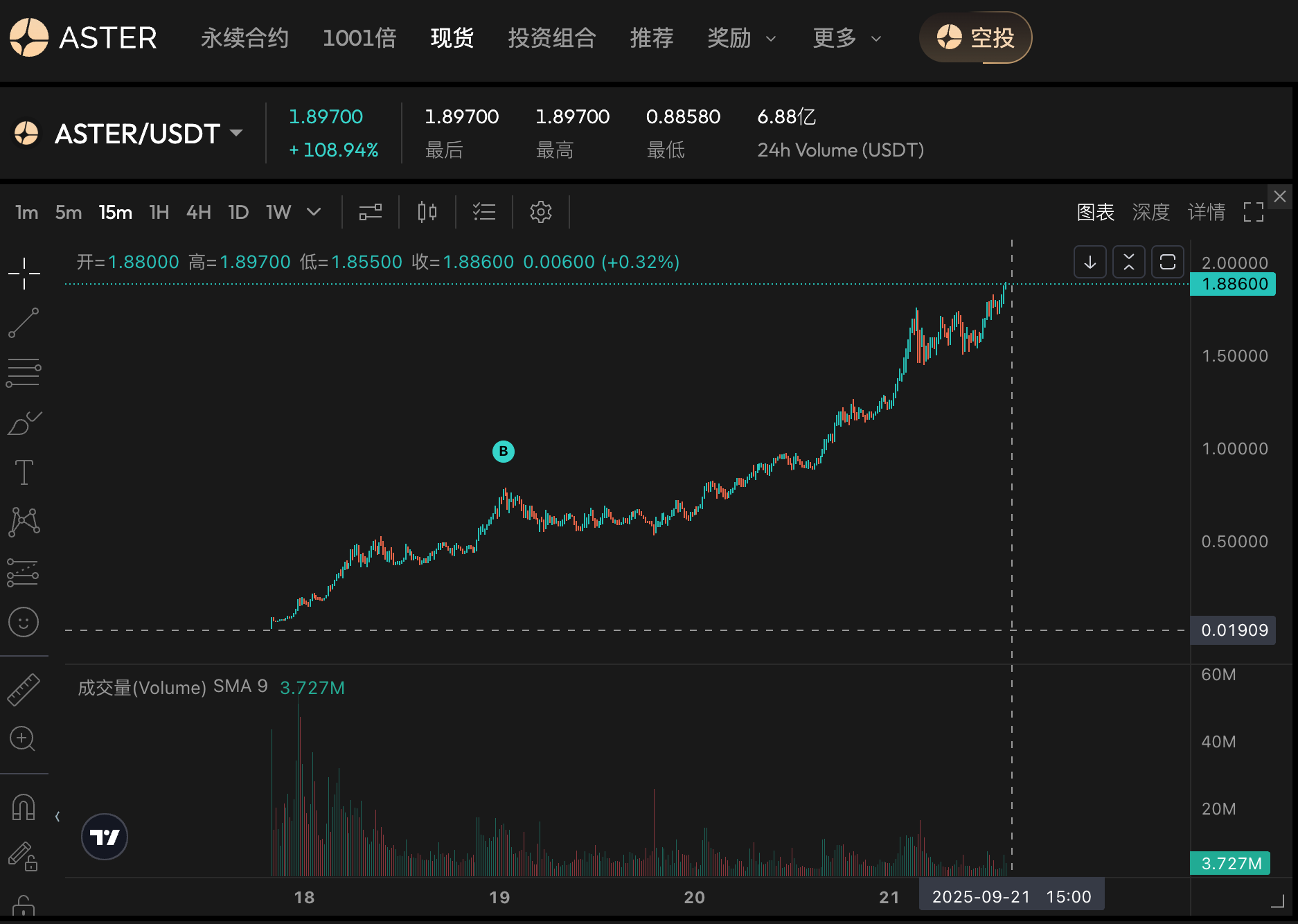 9月17号晚上八点Aster上线以来到现在不到五天的时间,0.1到2已经涨了最高20倍