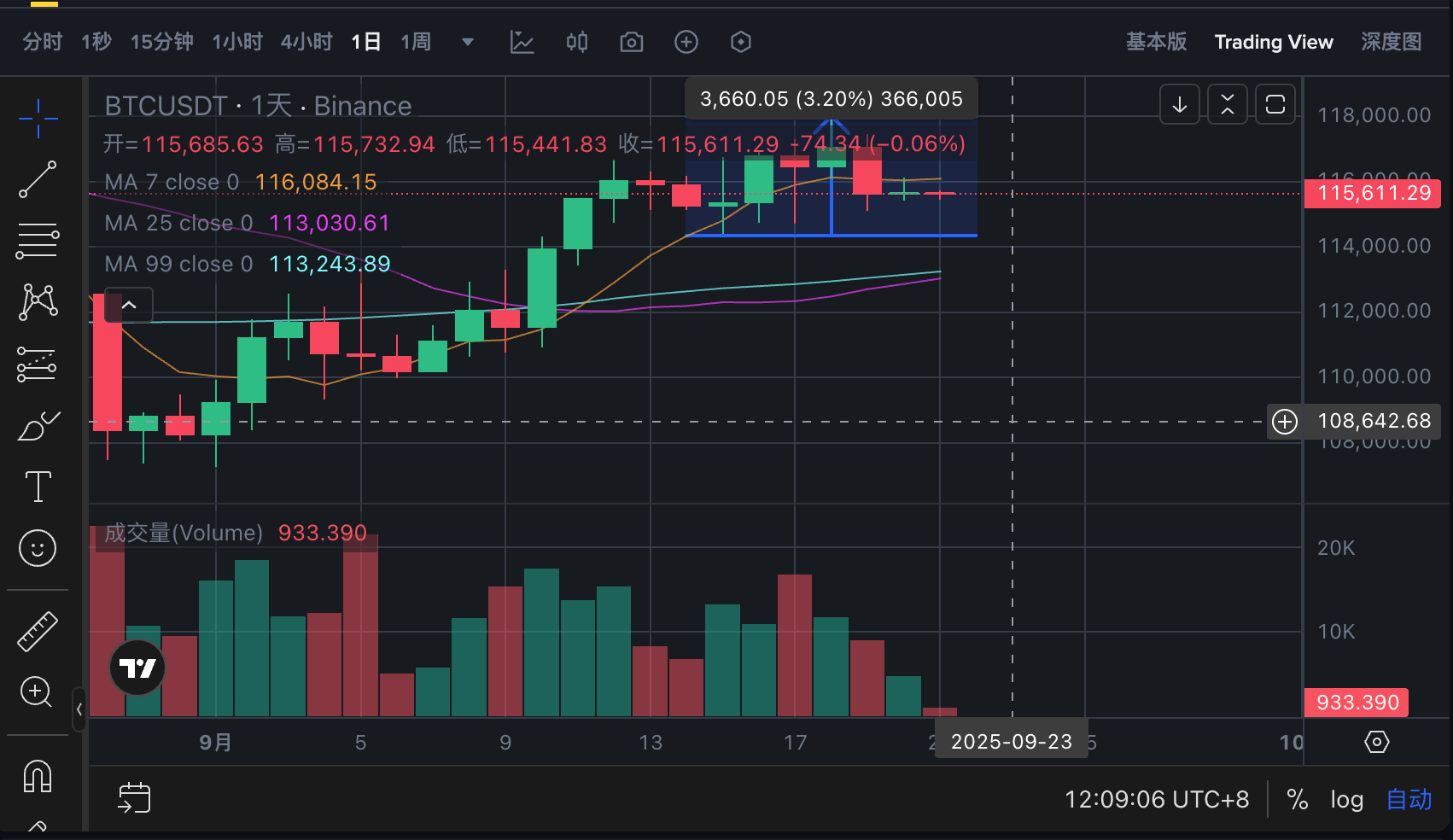 BTC 114300-118000 3000点的区间,冲高遇到阻力位回落过程中