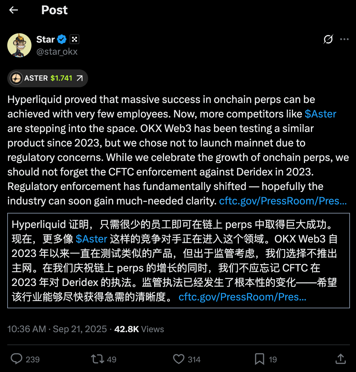 OKX CEO Star:因监管顾虑未上线类似Hyperliquid产品,希望该行业获得清晰监管框架