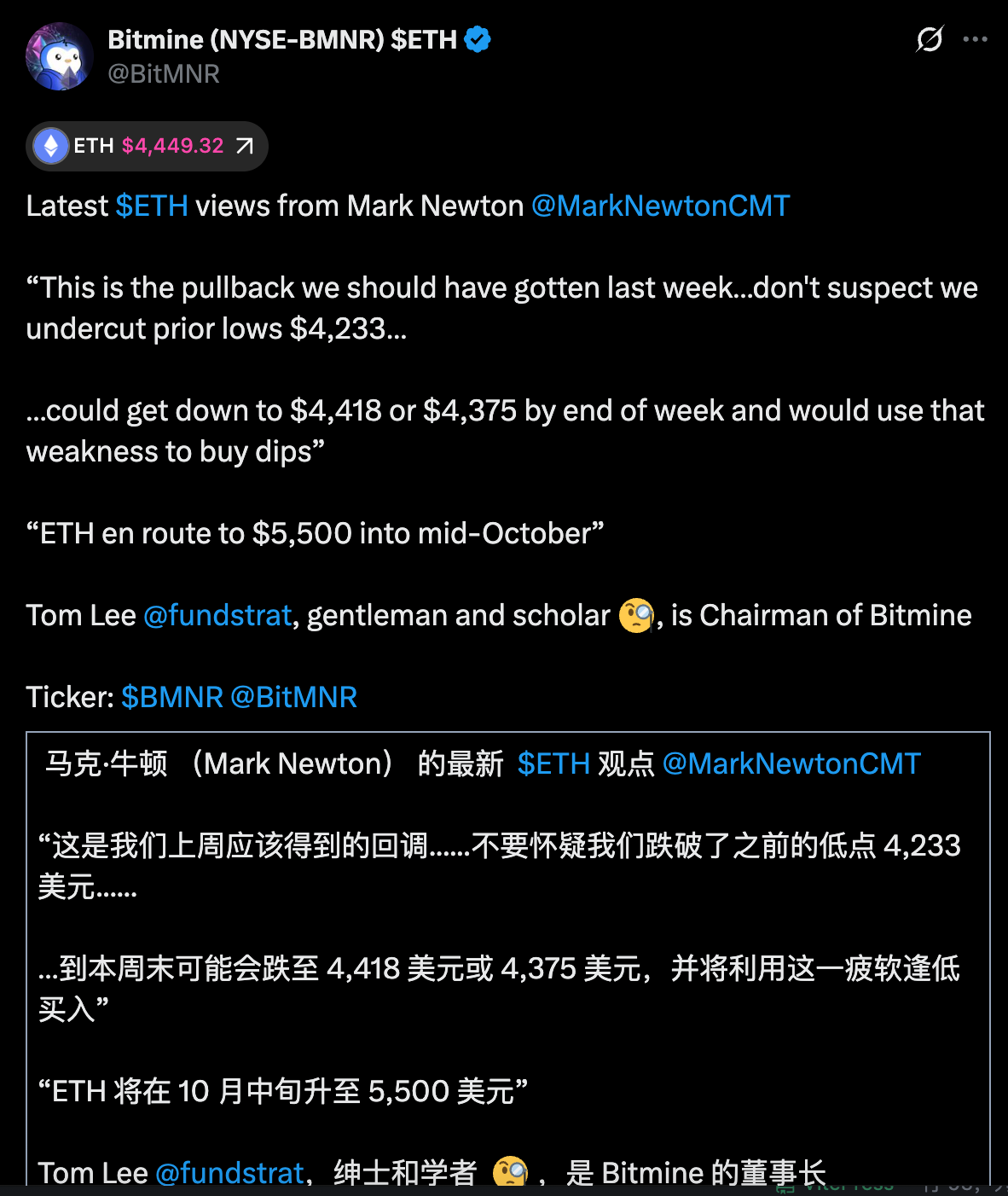 BlockBeats 消息,9 月 16 日,BitMine 转发旗下基金分析师 Mark Newton 的市场观点,其表示:「预计 ETH 不会跌破之前的低点 4233 美元,本周末可能回落至 4418 美元或 4375 美元,届时会利用这一弱势行情进行逢低买入。ETH 预计在十月中旬前上涨至 5500 美元。」