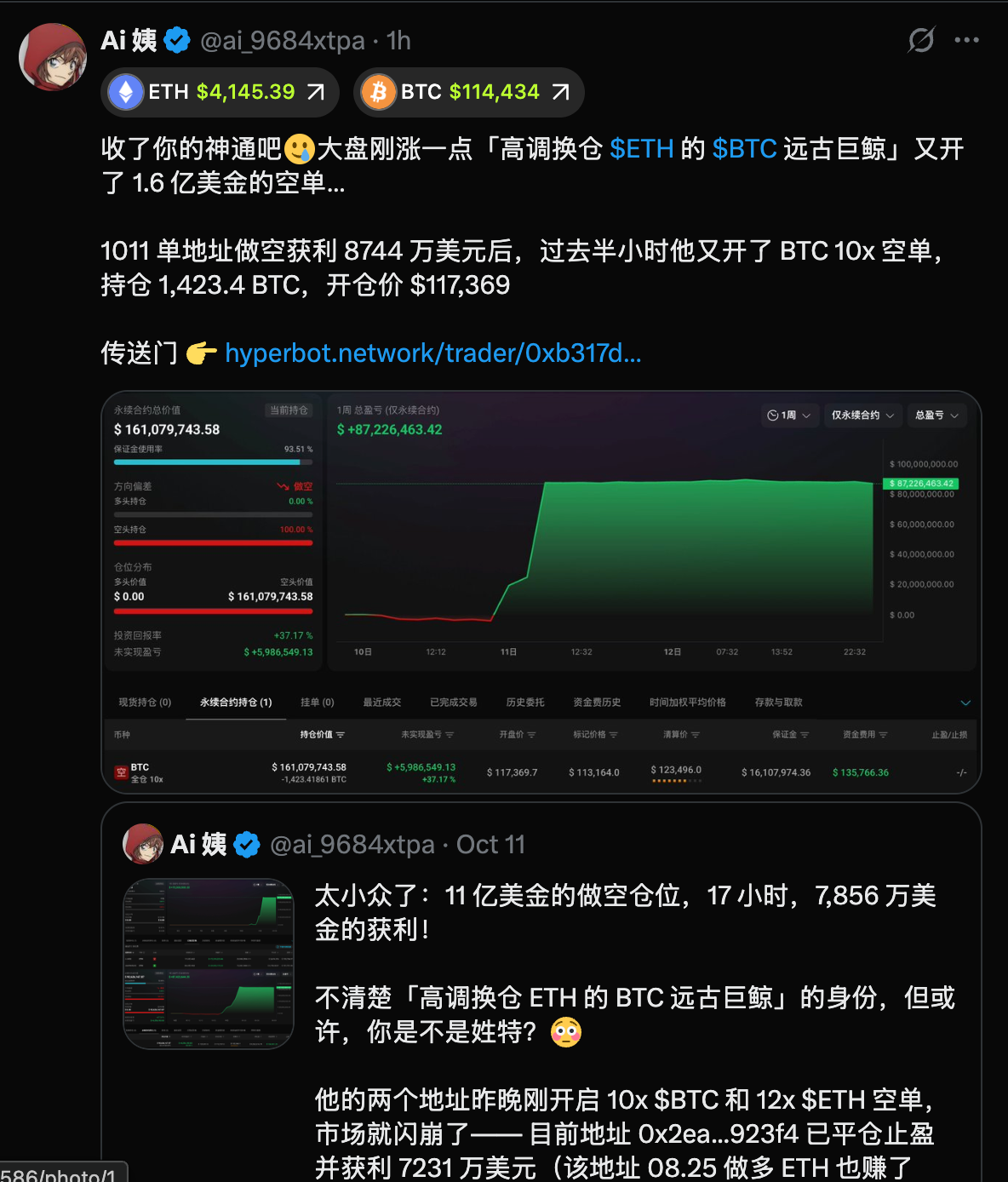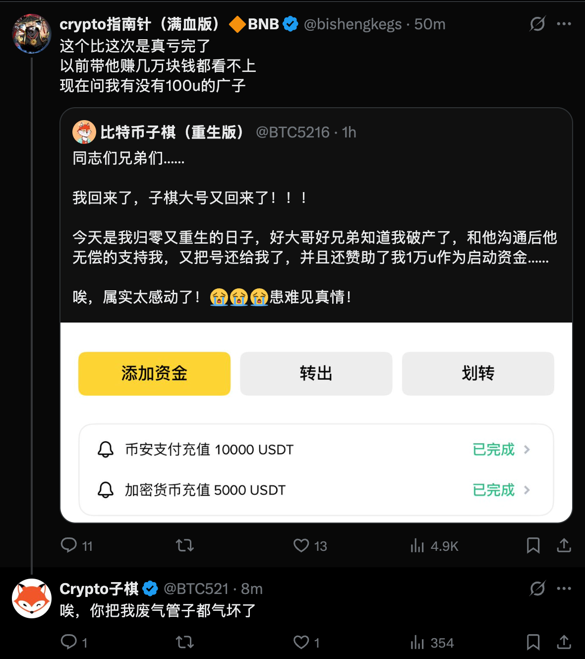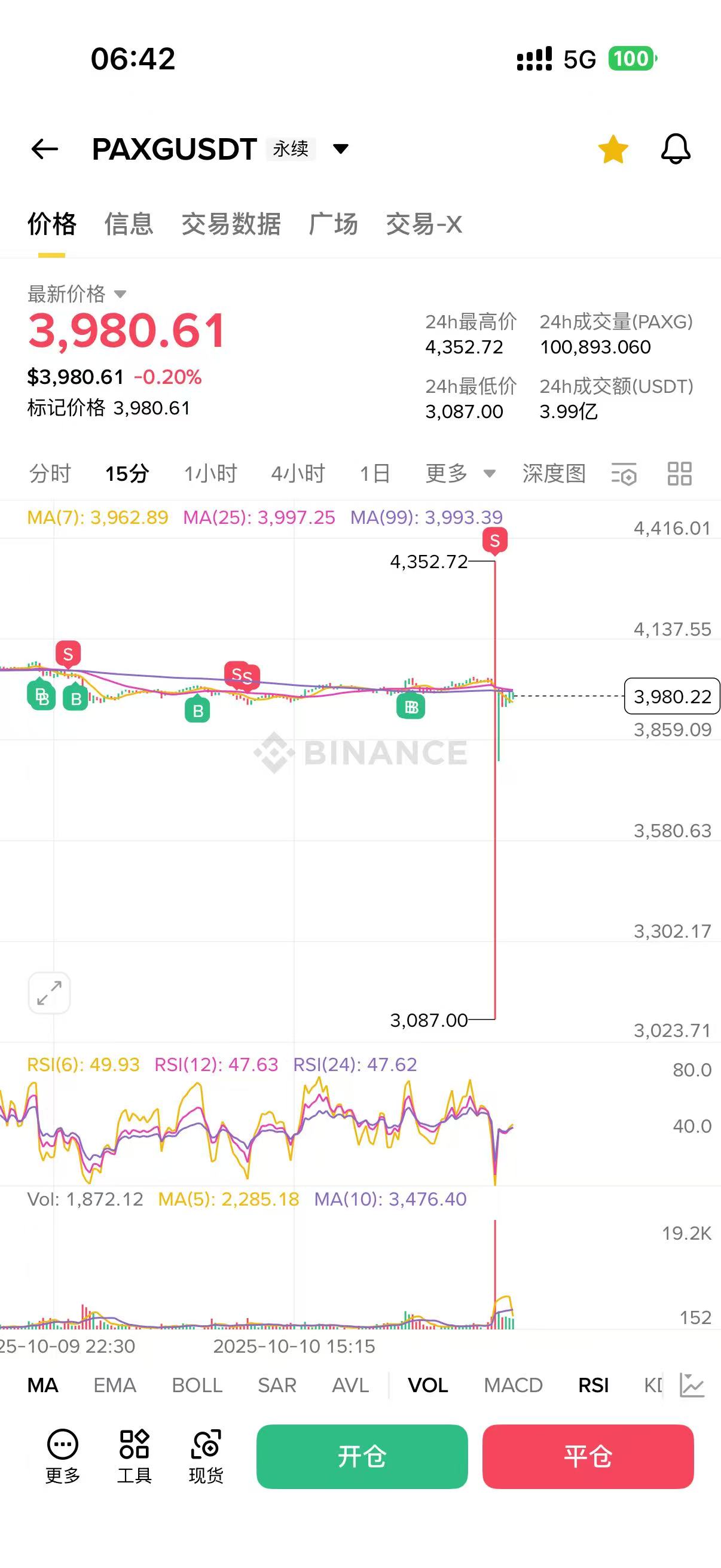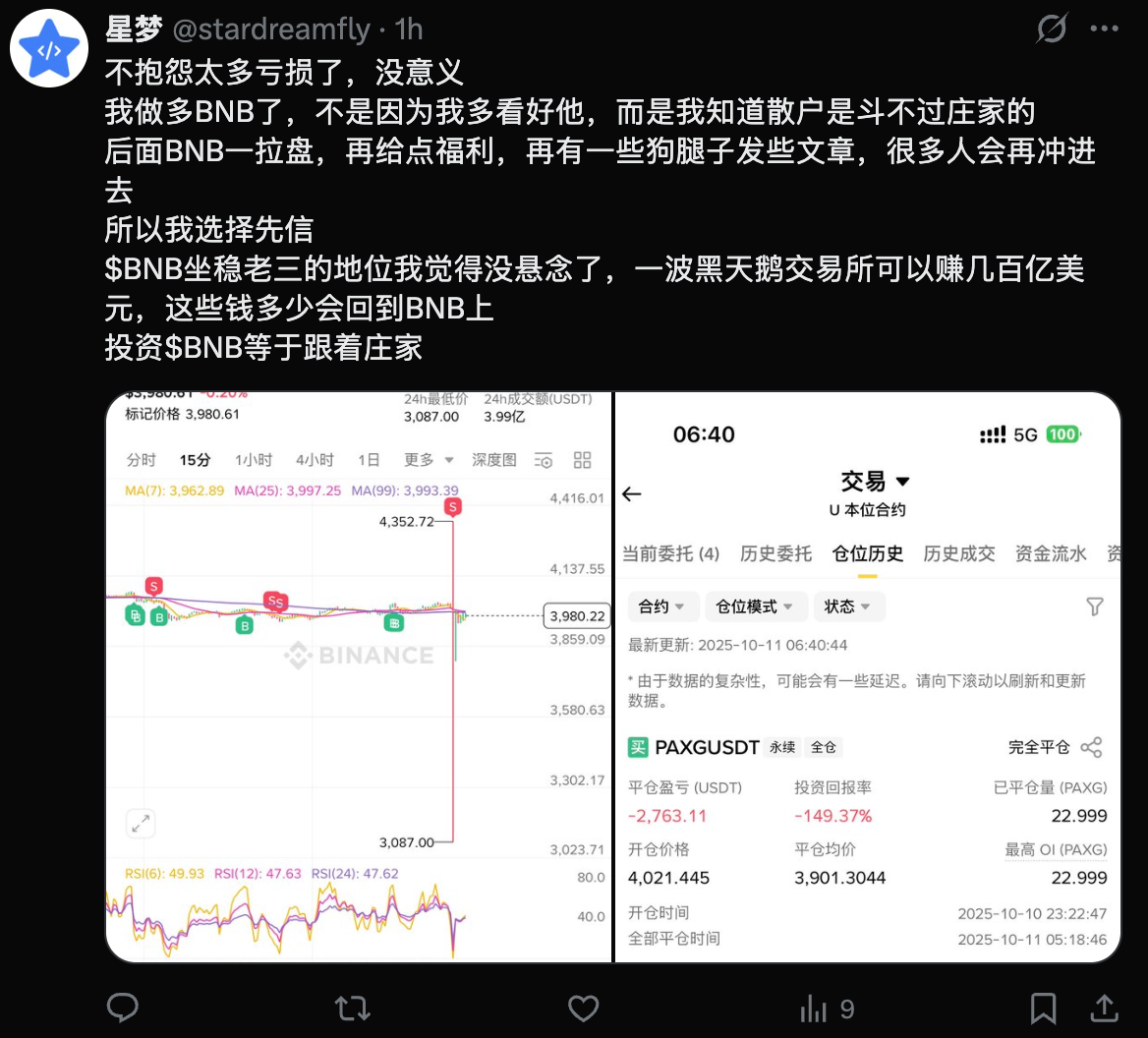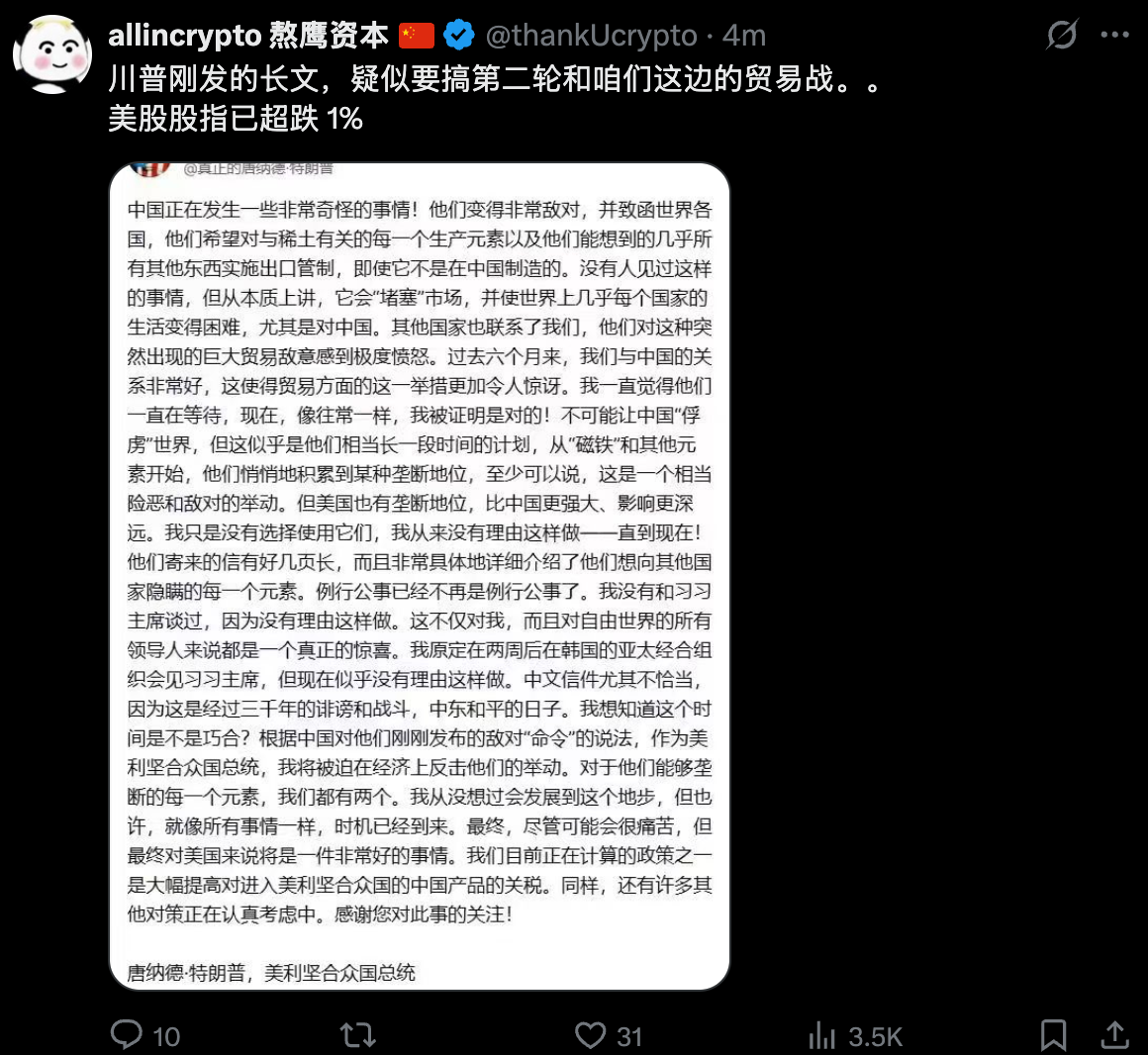 时间回到昨天10月10号,经历了国庆开始4,5w rmb玩合约到20多w,但是没有止盈,在行情回调的时候不断高杠杆抄底最后利润全部回吐还伤及本金。昨晚还在阴跌,我感到很累,加上Aster查询结果不到预期的1/5,我清空了所有做多网格,BSC的MEME币。最终只剩下4300u。然后我就看到了熬鹰发的川普的小作文,疑似第二轮贸易战要开打。
