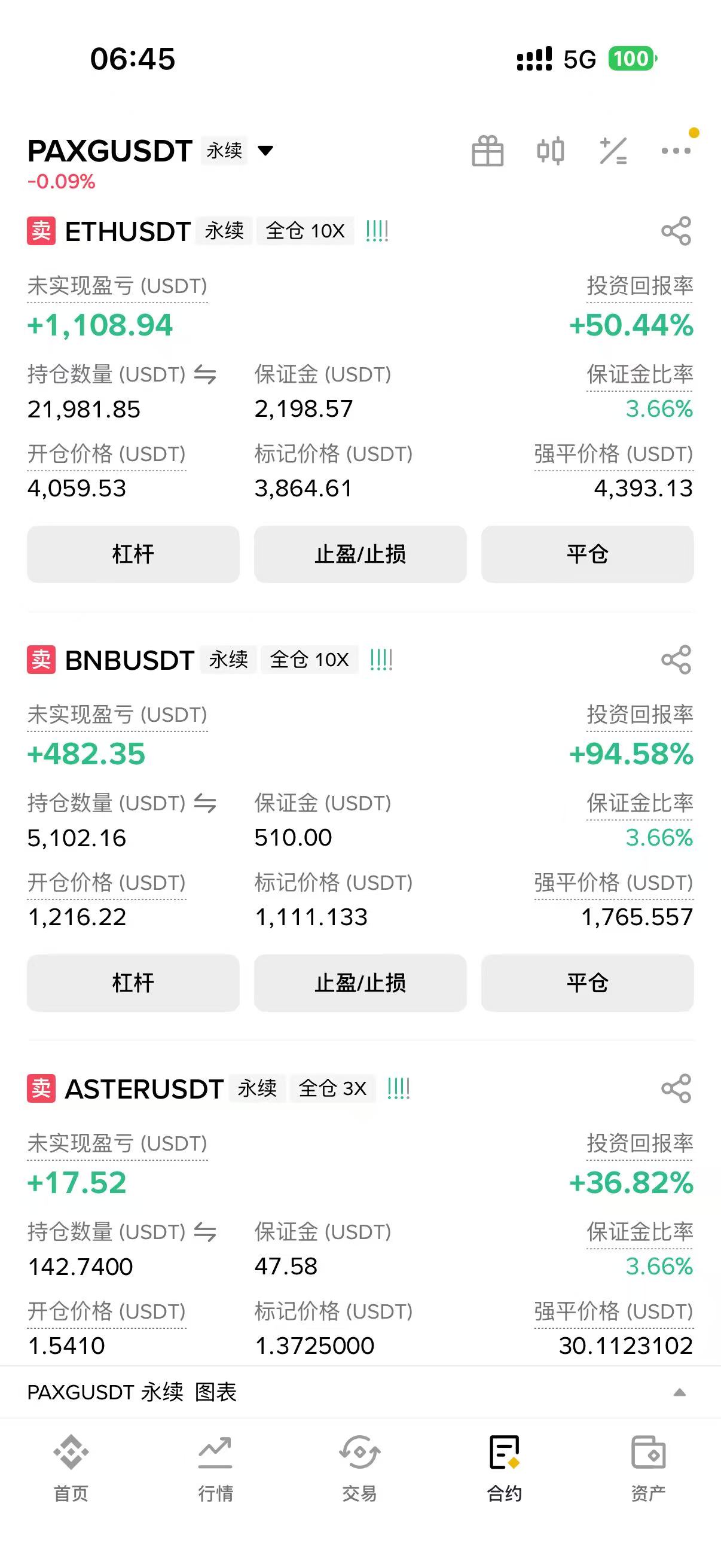 我在电光火石间规划好了仓位,做空ETH,BNB,Aster,做多黄金!仓位还不小,比如说50倍做多了60多万RMB的黄金【4000 * 7.1 * 23】,如下图: