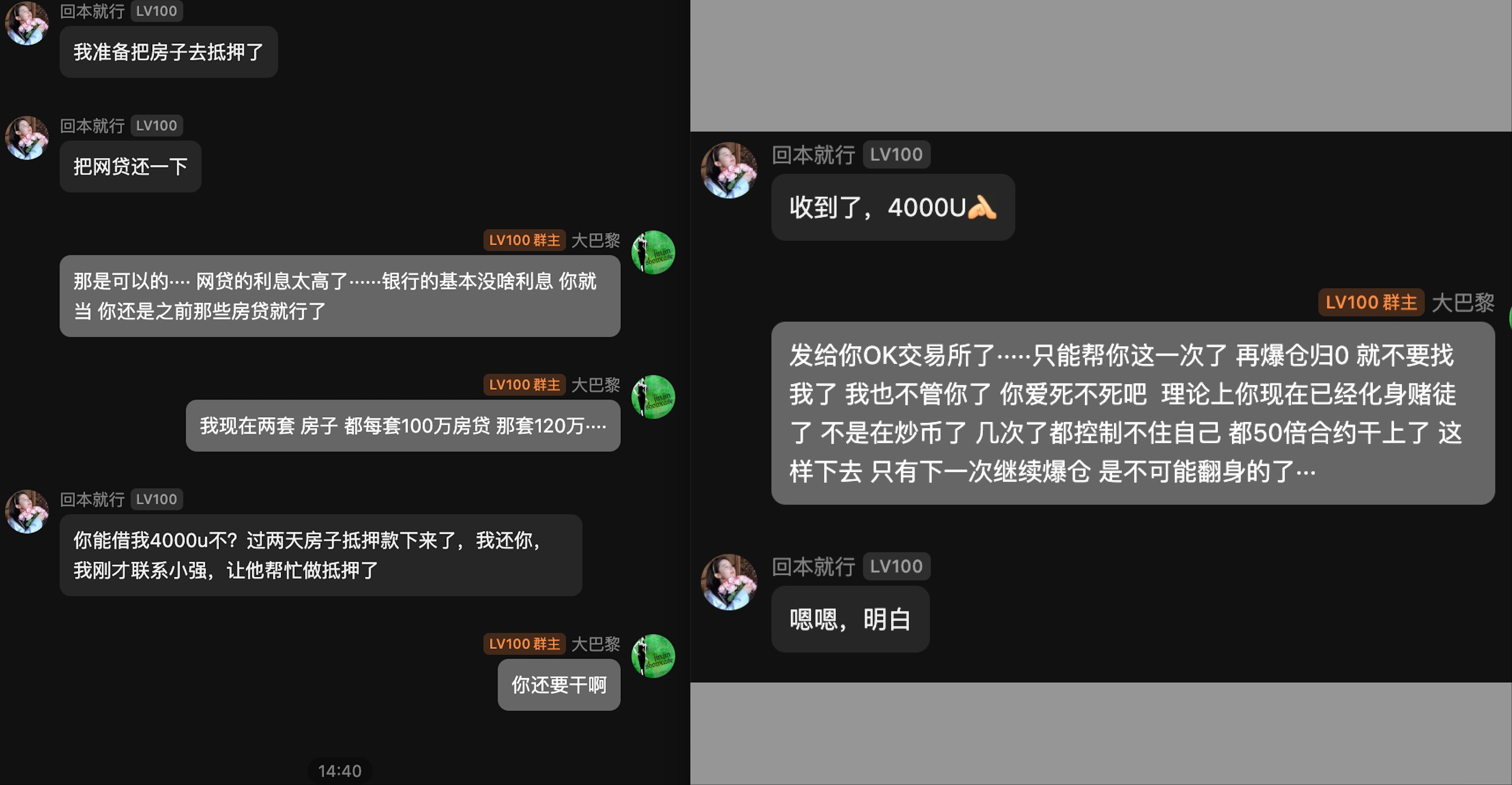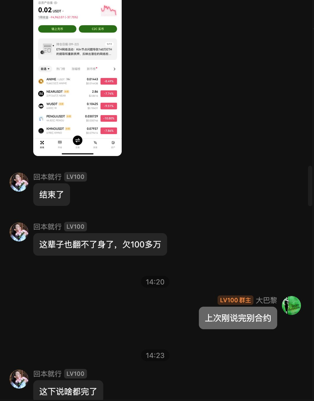 他现在负债100多万 每天催收电话一堆 现在又把最后希望的10万块钱再次爆仓了 而且他已经筹集不到本金了 哪怕有一个币钻石的话可以10倍 他现在也没有钱去买币了 现在经济不好导游也不好干了 他和他媳妇导游的收入从之前的每年三四十万 现在每年也只能收入10几20万了 如果他就此认了退圈 意味着100多万的负债要靠未来10年去偿还 而且网贷利息那么高 赚的都不够给利息 如果不甘心留在币圈 那翻身的本金都没了 又染上了合约 哪天没控制住好了伤疤忘了疼 又是再一次的爆仓